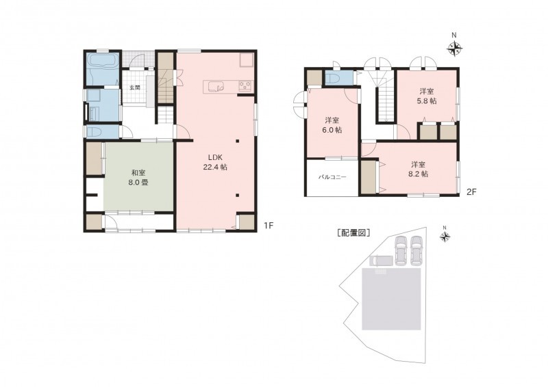 - システムキッチン、洗浄便座、モニタ付インターホン、駐車場2台分、トイレ2箇所、2Fバルコニー付
